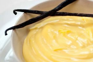 La crème pâtissière est faite avec 20 g de semoule de blé très fine, ¼ de litre de lait, une gousse de vanille, 65 g de cassonade, un demi-zeste de citron râpé, 1 jaune d’œuf, 65 g de crème liquide entière, 15 g de farine et 2 ml de rhum.