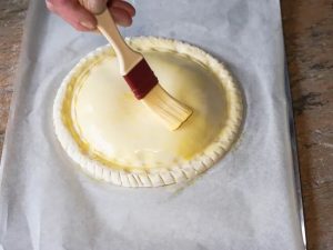 Pour le montage, utilisez un cercle que vous avez déjà beurré au préalable. Posez-le ensuite sur une plaque recouverte de papier de cuisson. Vous allez diviser la pâte en deux et garnir le fonds de la moule avec le premier disque. Ensuite, vous allez garnir le centre avec la crème et rabattre les bords de la pâte sur la crème. Après cela, vous couvrez avec l’autre moitié de pâte.